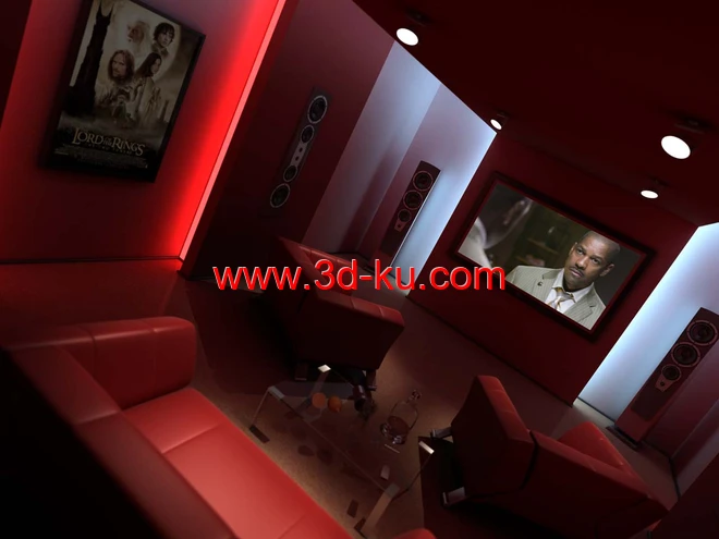 私人影院场景,放映室模型,音响,沙发,电视,玻璃桌子,3D模型