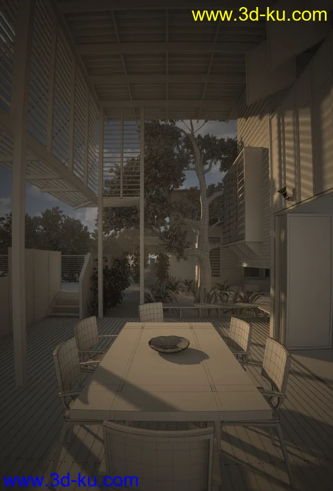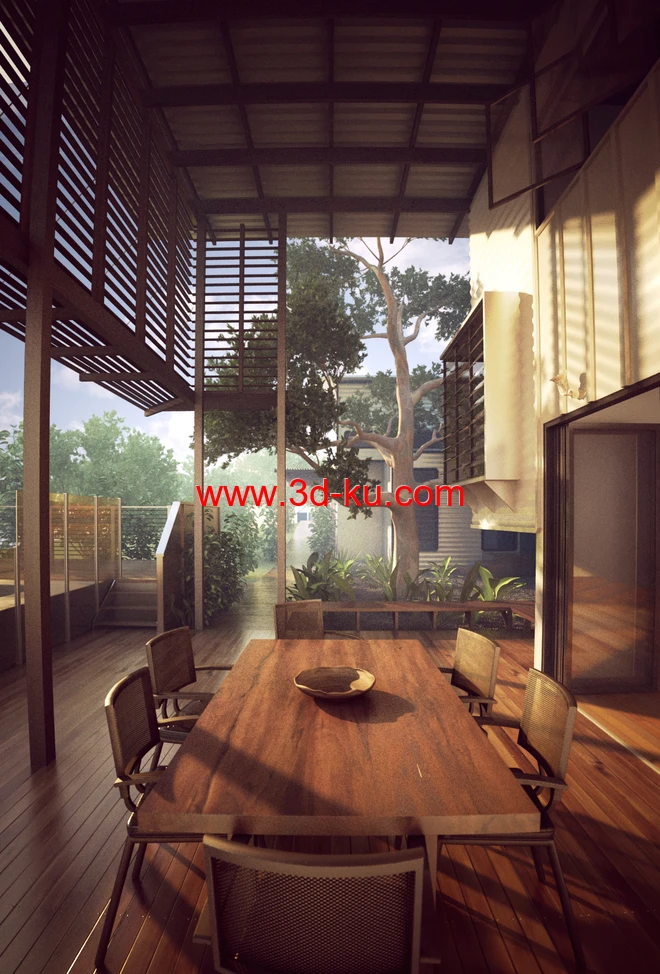 露天饭厅场景,木餐桌,木椅子模型,森林中的房子,3D模型