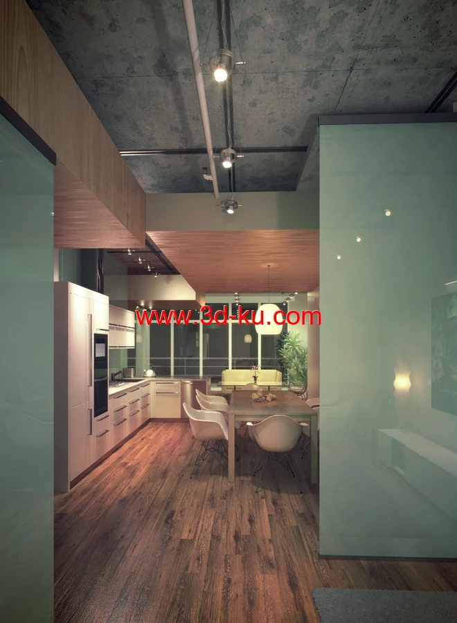 木地板场景,厨房模型,水泥天花,3D模型