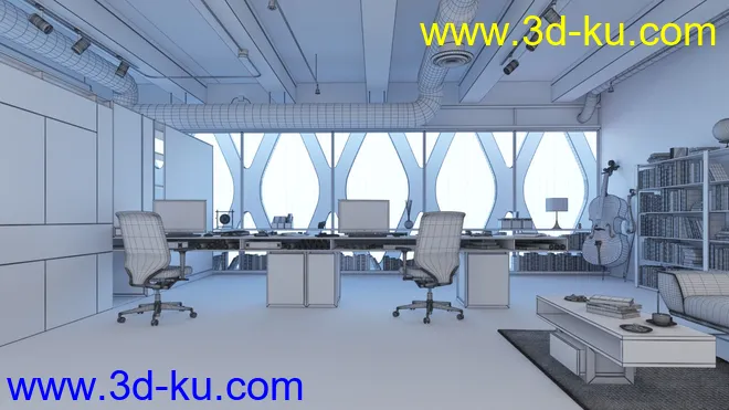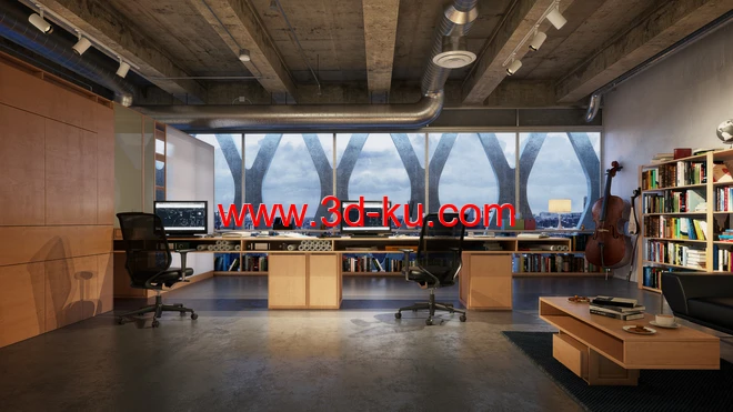 办公室场景,水泥结构,书架模型,大提琴模型,3D模型