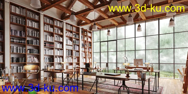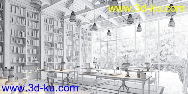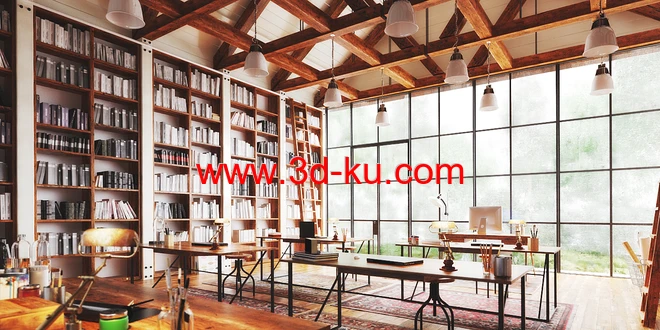 光亮透光的图书馆,阅读室场景,书籍,书架模型,3D模型
